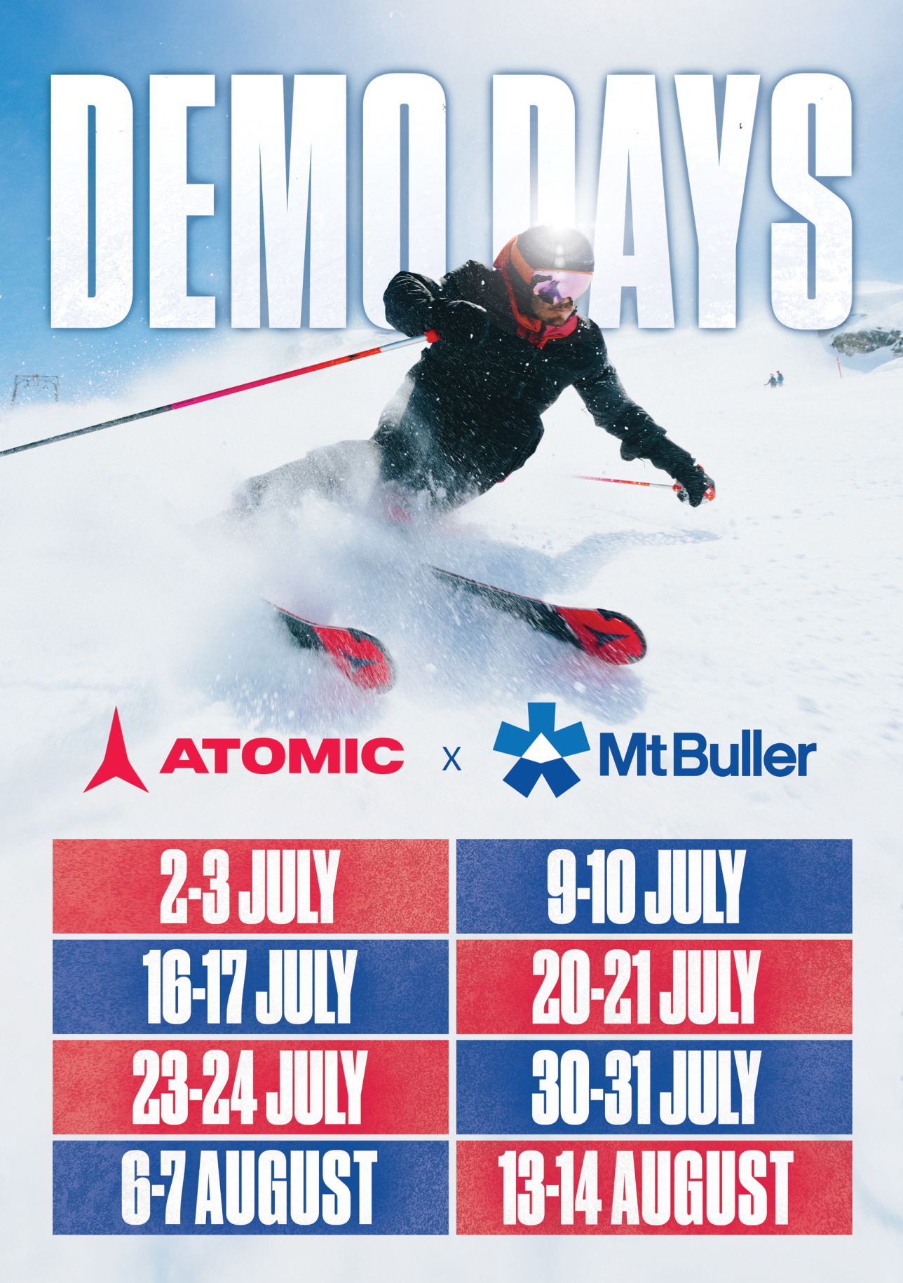 Try before you buy! Join us for Demo Days every Wednesday and Thursday across July and August (weather and snow permitting). Test the latest skis and snowboards on the slopes, chat with our expert team, and find your perfect fit. It’s the ideal way to discover your next ride — and when you’re ready, head to Altitude to make it yours.