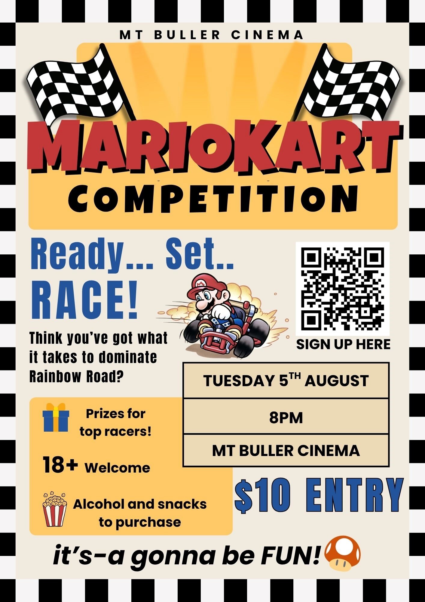 Let’s-a go! This event is 18+ and there is an entry fee of $10. Lots of prizes up for grabs for tops racers, a good mixture of alcohol and snacks in addition that match the vibes of the night! Don’t miss out! Spots are limited! Sign up below at this link HERE